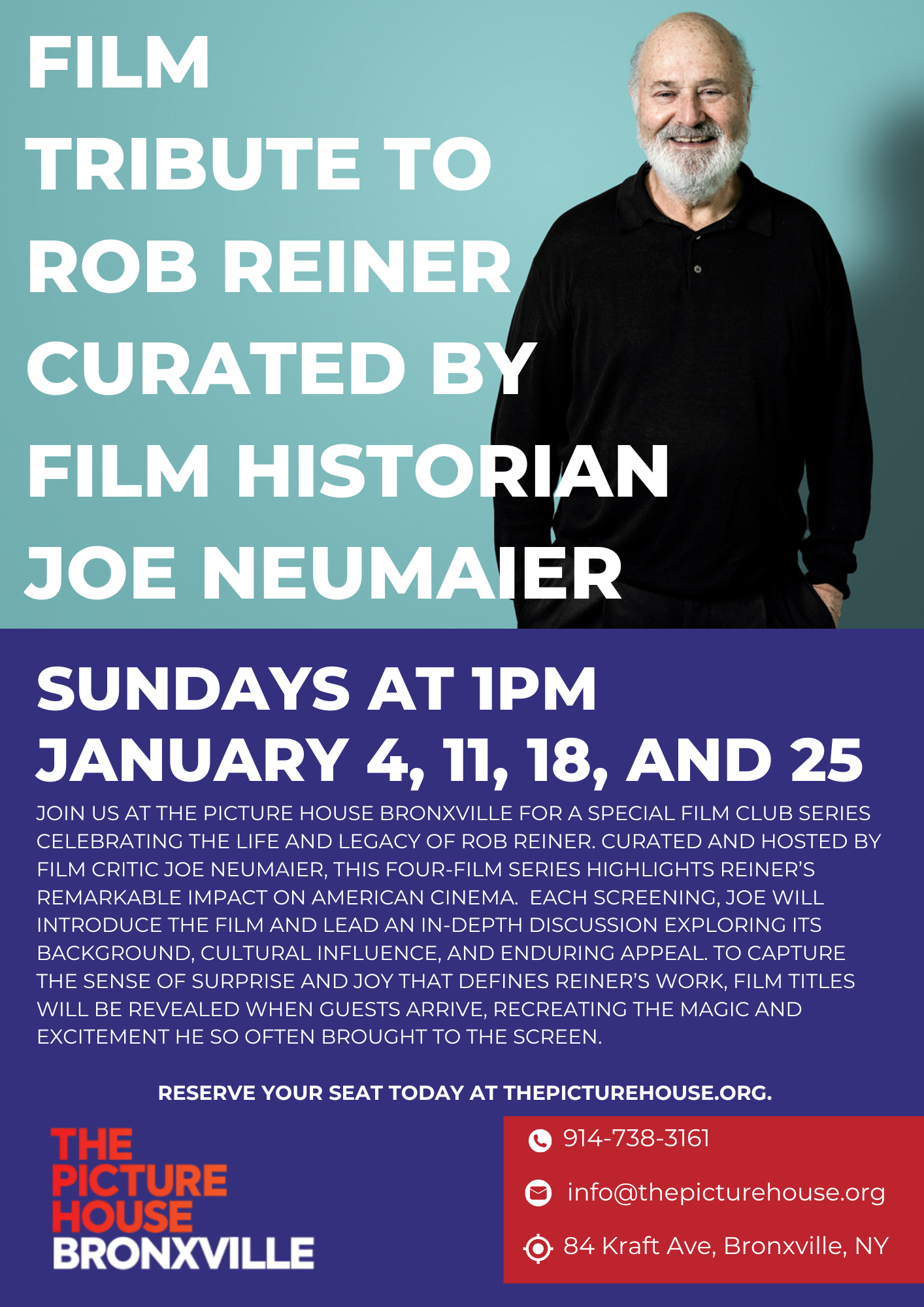 Join us at The Picture House Bronxville for a special film club series celebrating the life and legacy of Rob Reiner. Curated and hosted by film critic Joe Neumaier, this four-film series highlights Reiner's remarkable impact on American cinema. Each screening, Joe will introduce the film and lead an in-depth discussion exploring its background, cultural influence and enduring appeal. to capture the sense of surprise and joy that defines Reiner's work, film titles will be revealed when guests arrive, recreating the magic and excitement he so often brough to the screenPT2H2026-01-04Film Tribute To Rob Reiner - Curated by Film Historian Joe Neumaier"Film Tribute To Rob Reiner - Curated by Film Historian Joe Neumaier"Showtimes