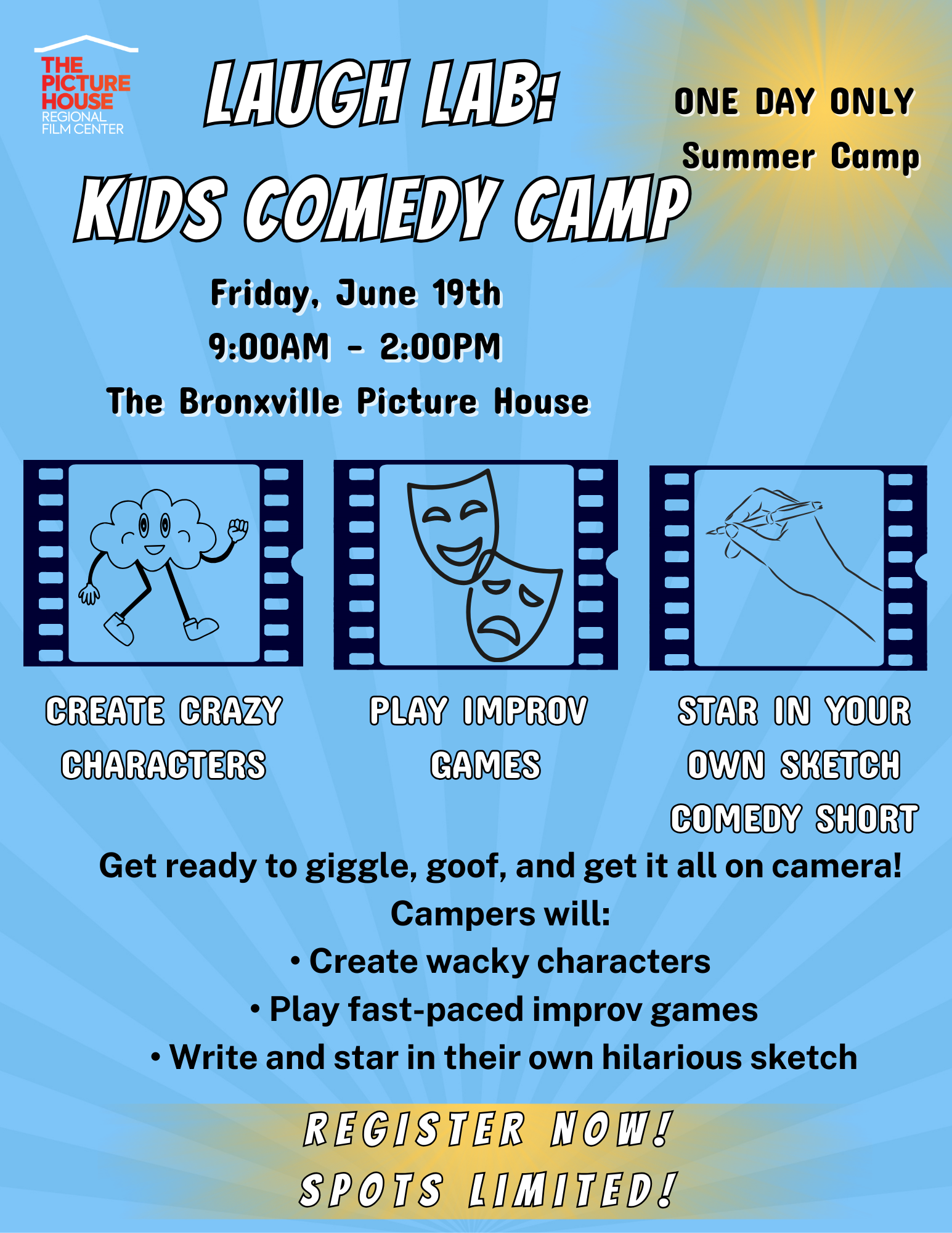 Get ready to giggle, goof, and get it all on camera! In this high-energy comedy camp, campers will create wacky characters, play improv games, and write and star in their own hilarious sketch comedy short. Think SNL, but funnier!PT5H2026-06-19Led by our Director of Education Russell Katz