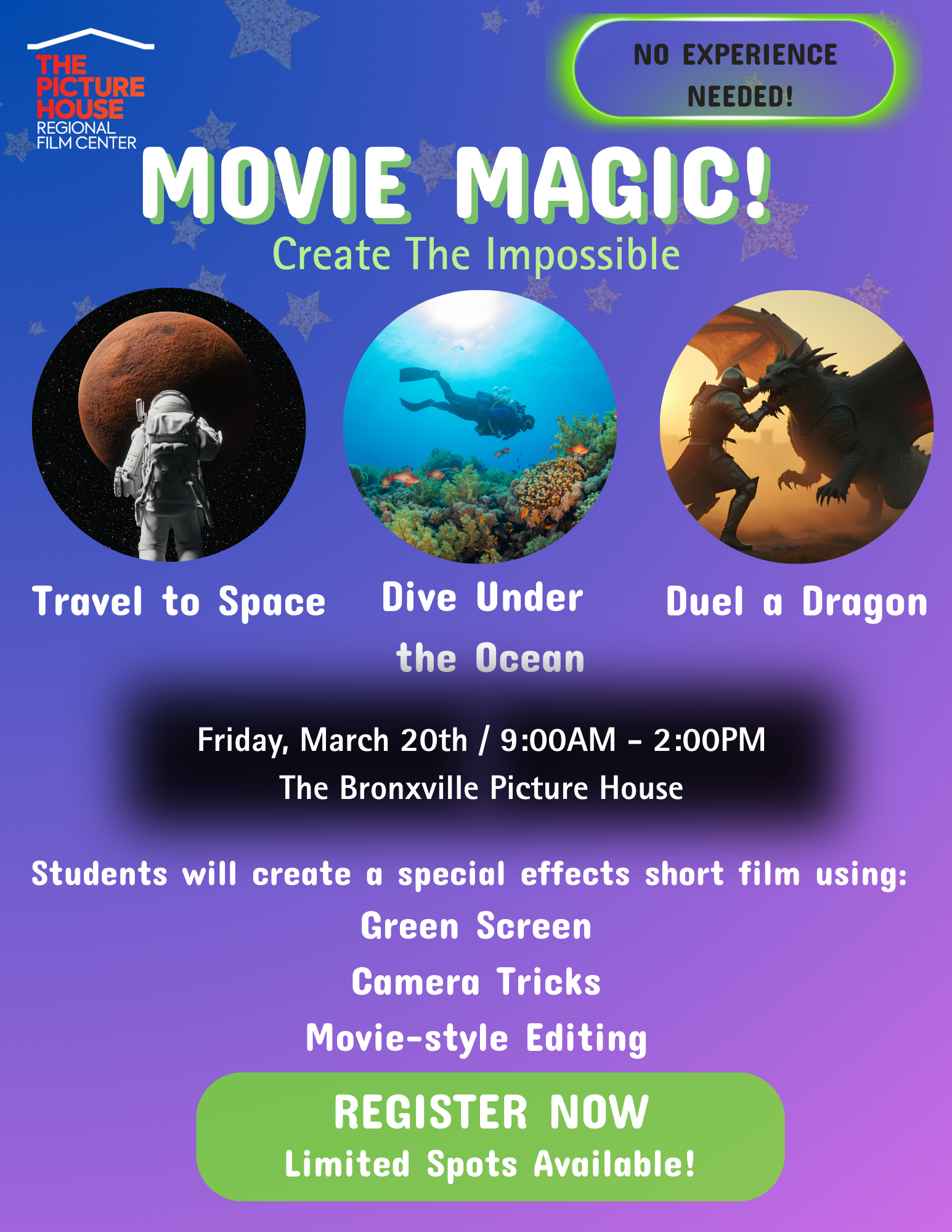 Learn how the pros create images of the impossible. Travel to space or to the depths of the ocean, or duel a dragon… all without leaving the studio! Students will create a special effects-driven short film using green screen, camera tricks, and editing. When you collaborate, anything you dream can come to life!PT5H2026-03-20Led by our Director of Education Russell Katz