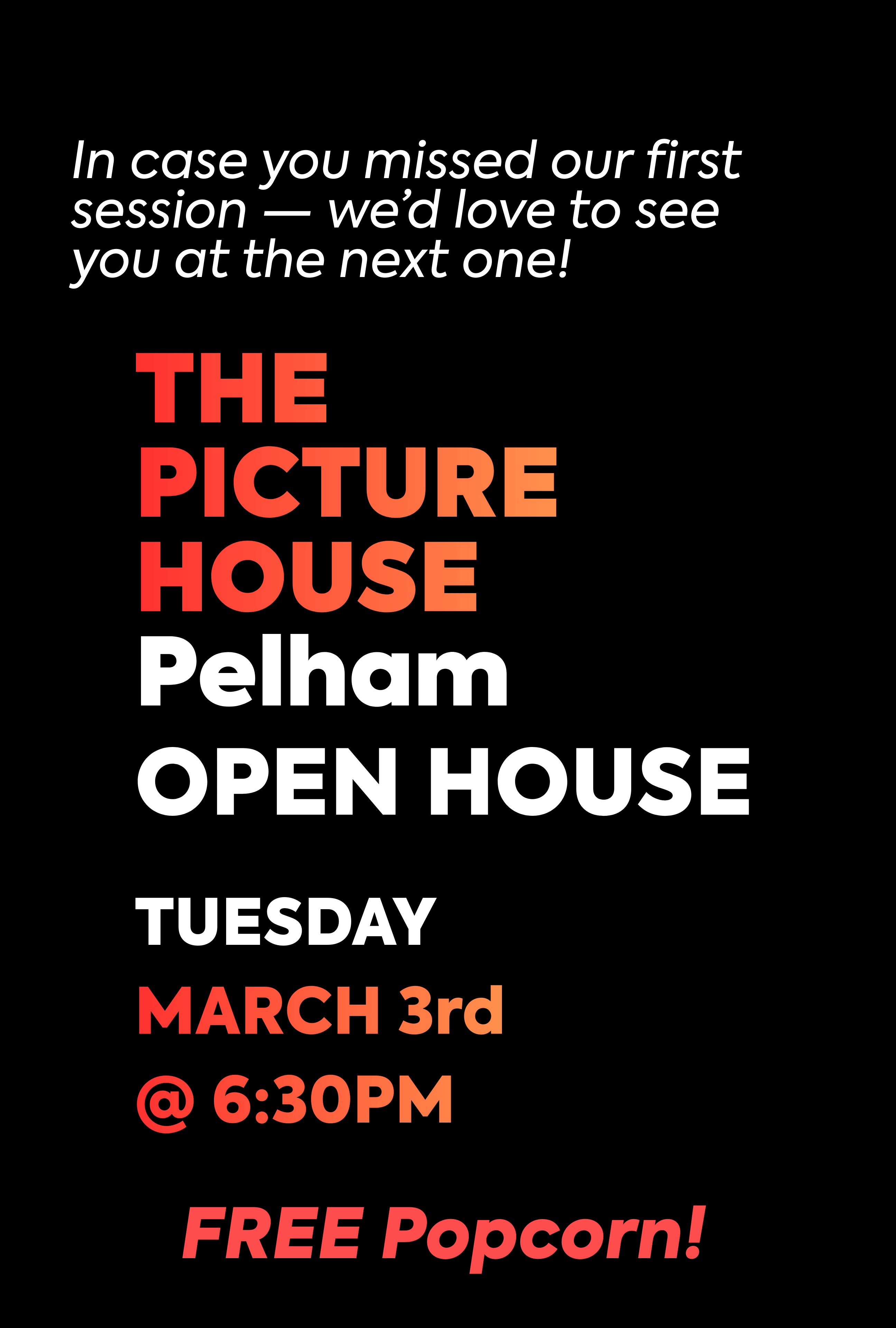 Join us for a presentation on The Picture House’s current programming and the evolving moviegoing landscape, followed by an open discussion with staff, Board members, and the community—we’re your hometown cinema and want to hear your views. The evening runs from 6:30–8:30 PM and includes FREE POPCORN, and we encourage attendees to arrive at the start so everyone can fully participate in the discussion.PT2HOpen House - TPH Pelham"Open House - TPH Pelham"Showtimes