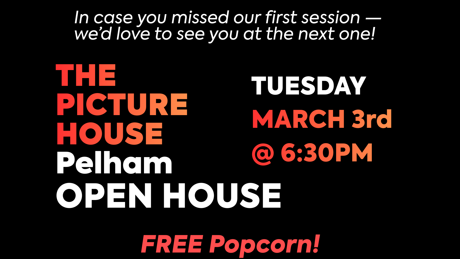 Join us for a presentation on The Picture House’s current programming and the evolving moviegoing landscape, followed by an open discussion with staff, Board members, and the community—we’re your hometown cinema and want to hear your views. The evening runs from 6:30–8:30 PM and includes FREE POPCORN, and we encourage attendees to arrive at the start so everyone can fully participate in the discussion.PT2H2026-03-03Open House - TPH Pelham"Open House - TPH Pelham"Showtimes